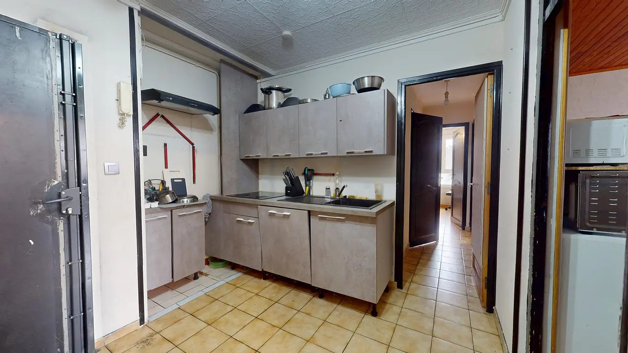 Cette colocation de quatre chambres s'ouvre sur une cuisine équipée d'un évier, de plaques de cuisson, d'un lave-vaisselle ainsi que de nombreux rangements. Un placard accueillant un lave-linge et un sèche-linge est présent dans cette pièce.