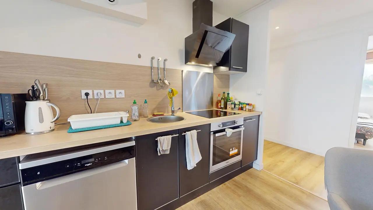 Une cuisine moderne, ouverte sur le salon, équipée d'un grille-pain, bouilloire, d'un réfrigérateur, d'un micro-ondes, d'un lave-vaisselle, d'une plaque de cuisson, d'une hotte, d'un four et de nombreux rangements.