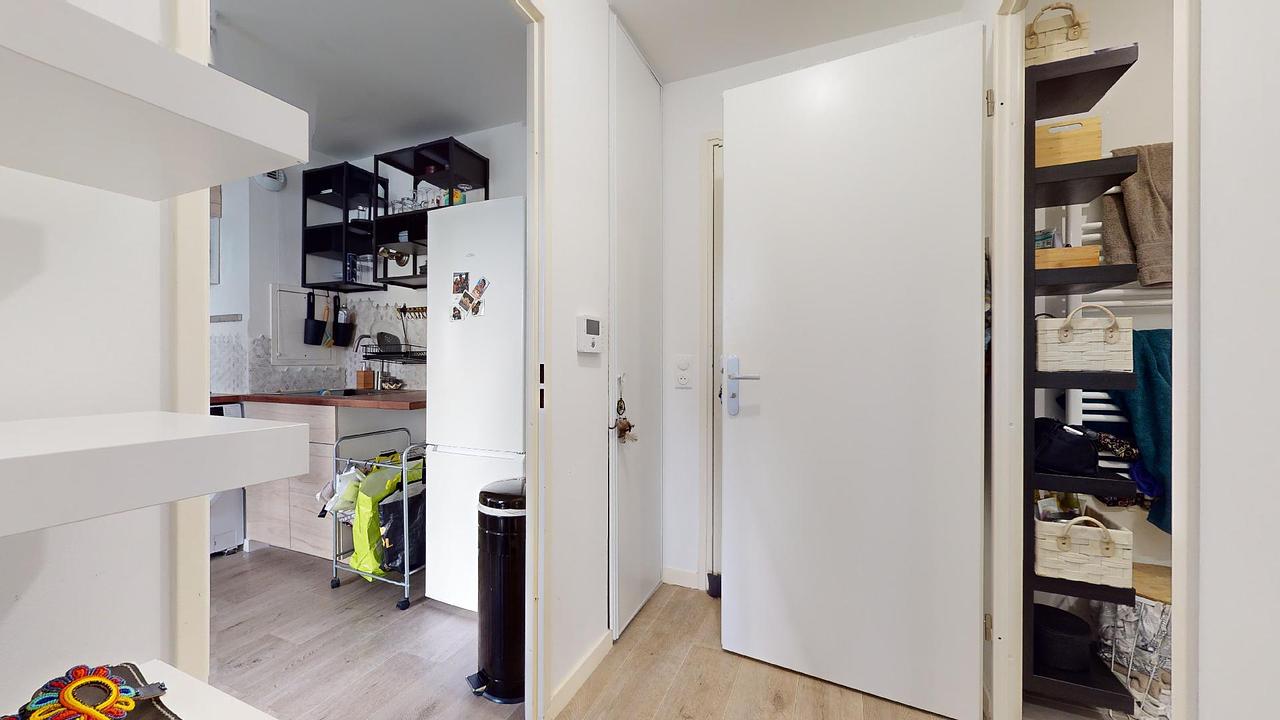 La chambre, séparée du reste de l'appartement, est agencée de manière optimale avec un lit double doté d'un sommier intégrant des espaces de rangement, un dressing, ainsi qu'une commode. Enfin, la salle d'eau est pourvue d'une élégante douche, de toilettes et d'un sèche-serviette.