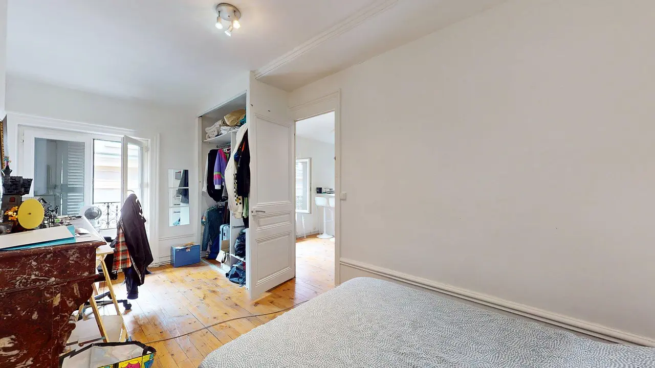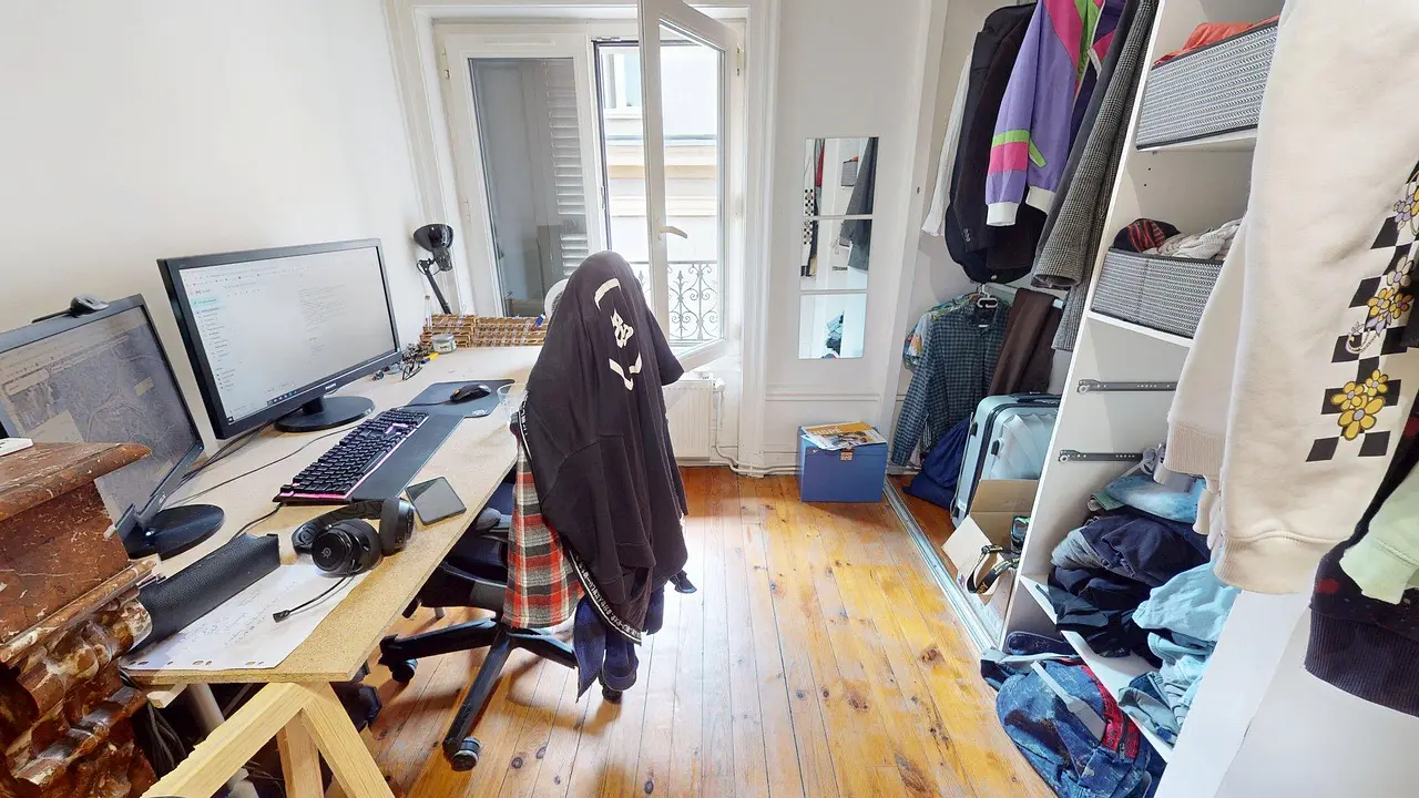 La chambre est spacieuse, elle dispose d'un lit double, d'un bureau avec une chaise ainsi que d'un grand dressing.