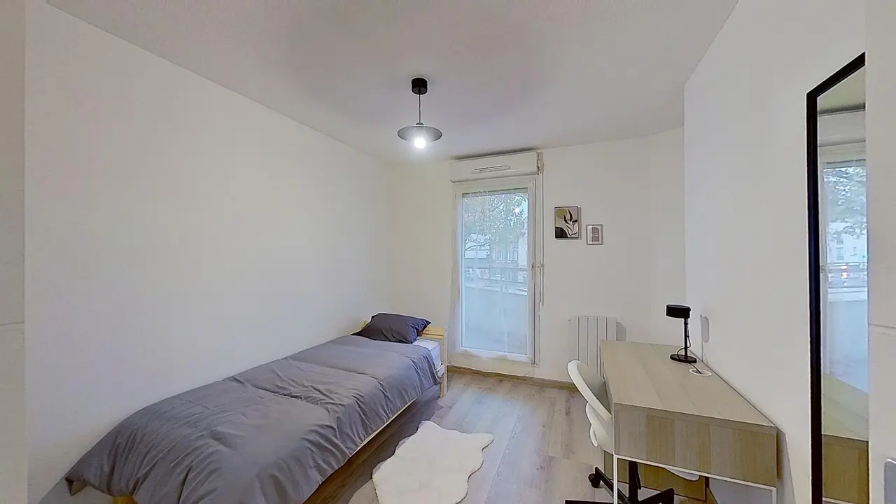 La chambre est équipée d'un lit simple, d'une table de nuit, d'un bureau et une penderie.