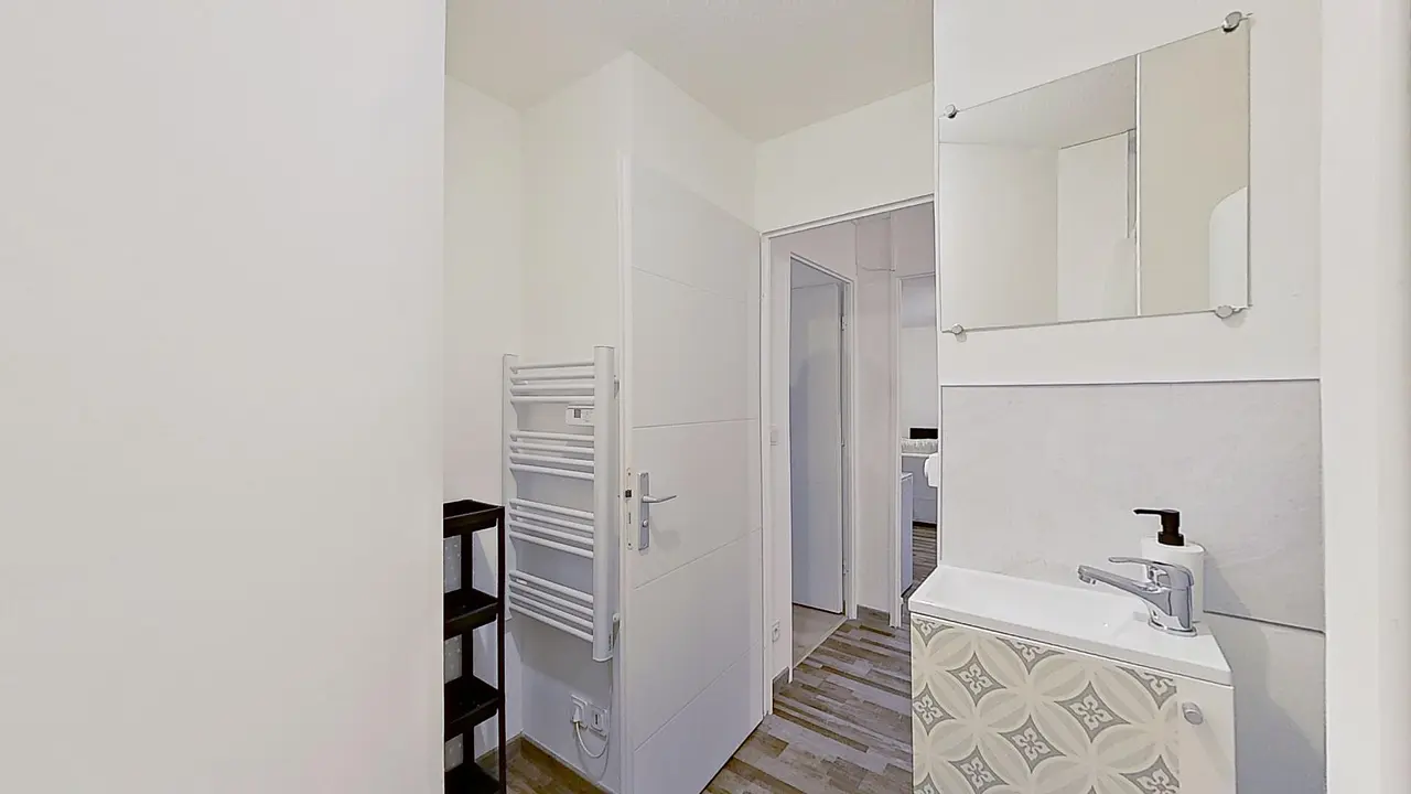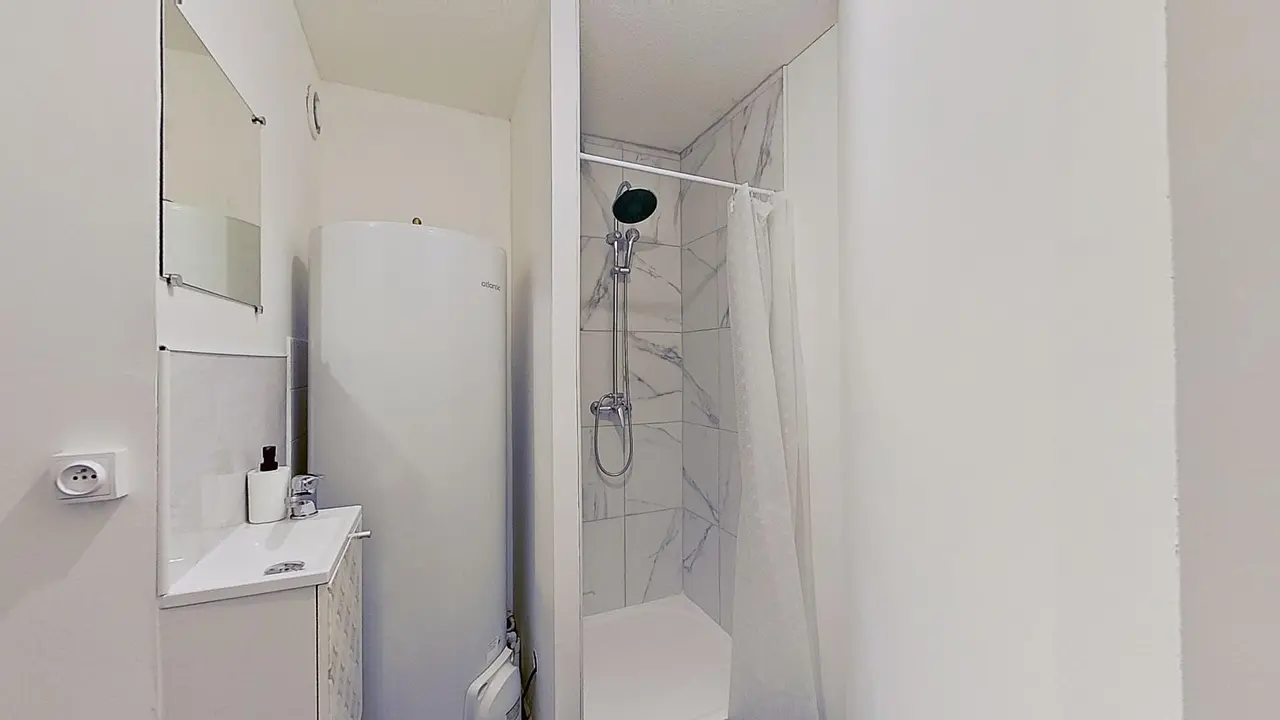 La troisième salle d'eau, non privative, possède une douche, un meuble vasque avec miroir et un sèche-serviette. Il y a également une machine à laver.