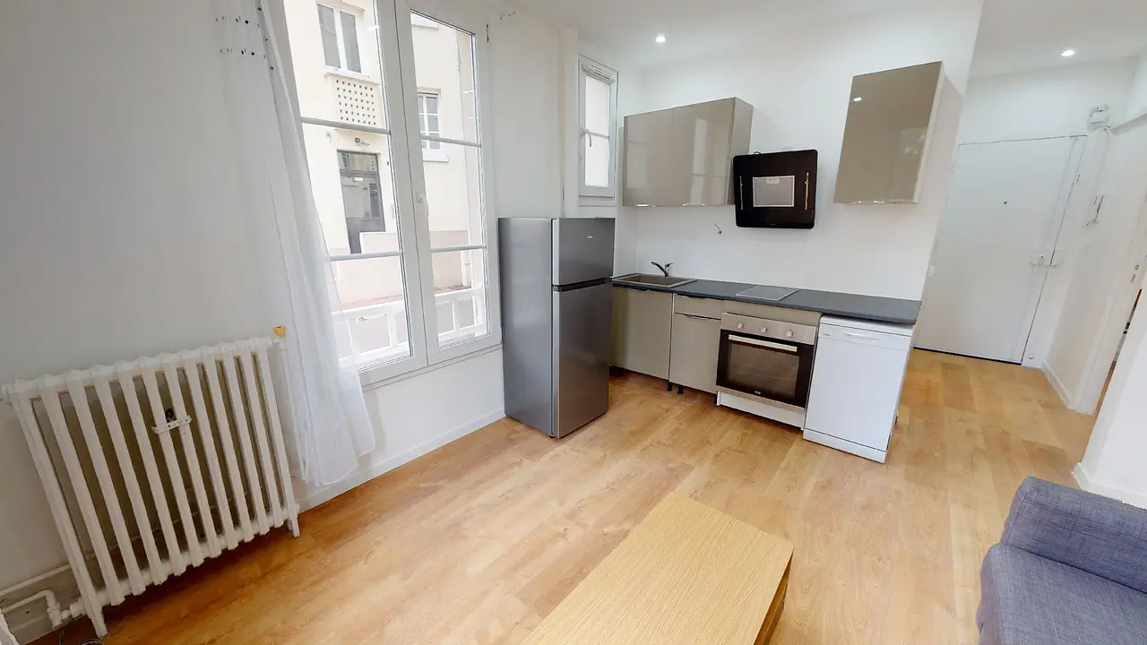 La colocation comporte une agréable pièce de vie avec cuisine ouverte équipée (frigo, lave vaisselle, four, plaques de cuisson, hotte et rangement) et un coin salon avec canapé et table basse.