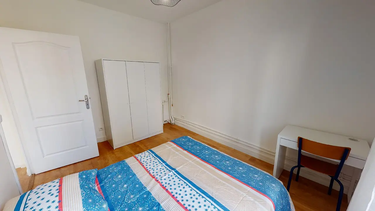 La chambre de presque 11m2 est équipée avec un lit double, bureau et placard de rangement