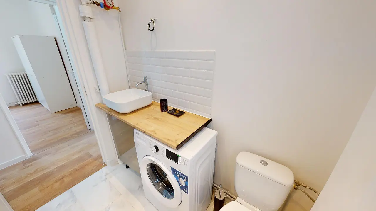 La salle de bain est quant à elle aménagée avec une douche, un wc, une machine à laver et une vasque.