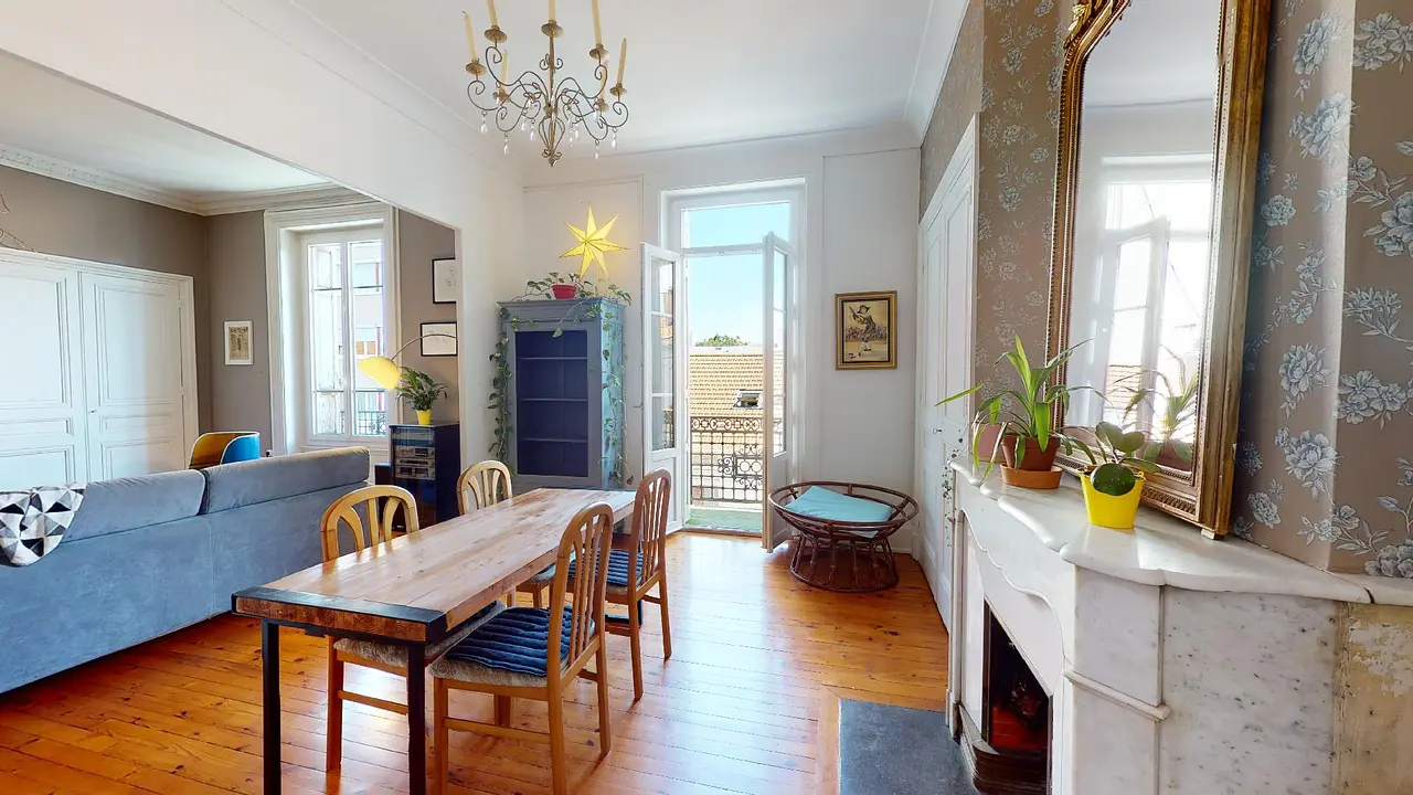 Le logement se compose de deux chambres, d’une salle de bain, d’un WC indépendant, d’une cuisine et d’un grand séjour composé de deux salons et d’une salle à manger.