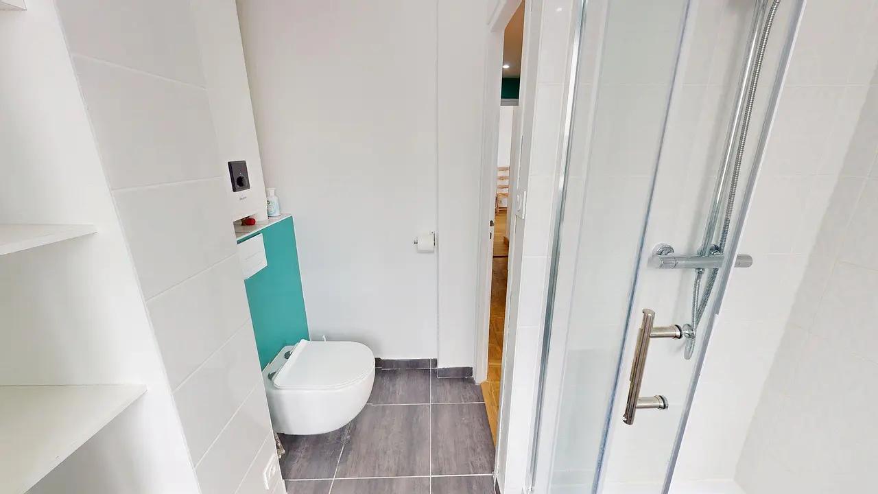 La salle d'eau commune est fonctionnelle: elle comporte une douche, un meuble vasque avec miroir, un lave-linge, des WC ainsi que des rangements.