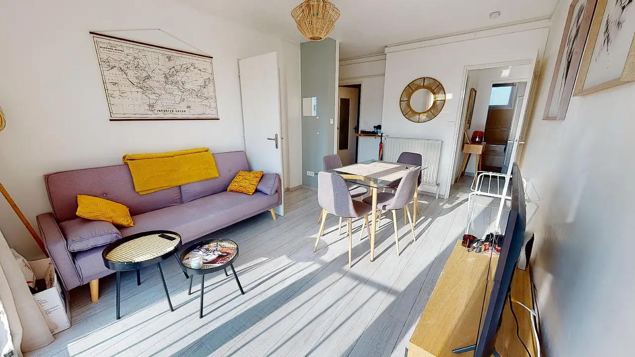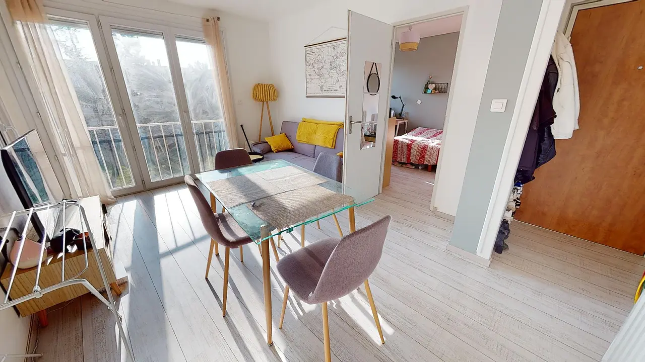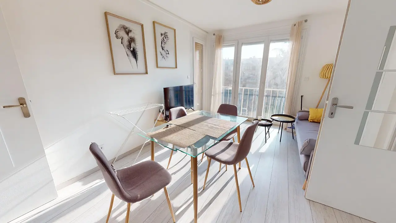 Cet appartement comporte un salon très lumineux aménagé avec un canapé, des tables basses, une TV et une table à manger idéale pour partager des repas entre colocataire.