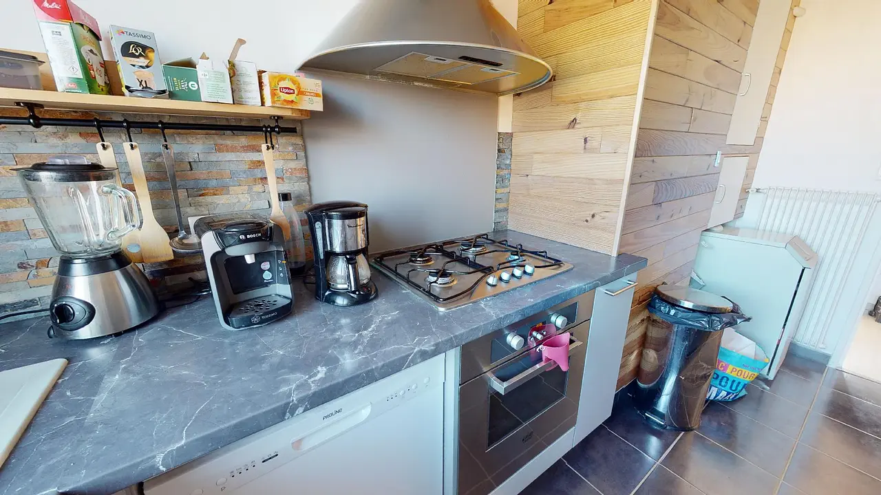 La cuisine quant à elle est séparée et équipée avec tout le nécessaire : four, plaques de cuisson, frigo, micro-ondes, lave vaisselle, et rangements.