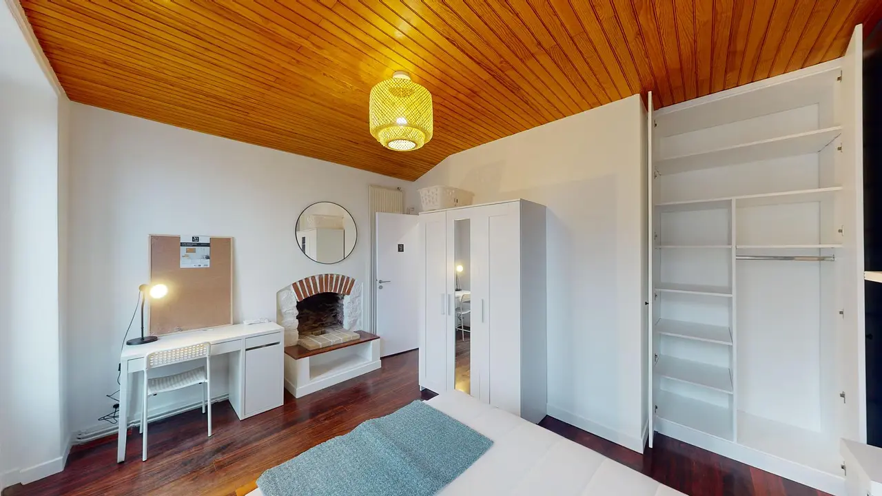 La chambre est louée avec un bureau, un lit, une penderie, un placard ainsi qu'une cheminée décorative.
