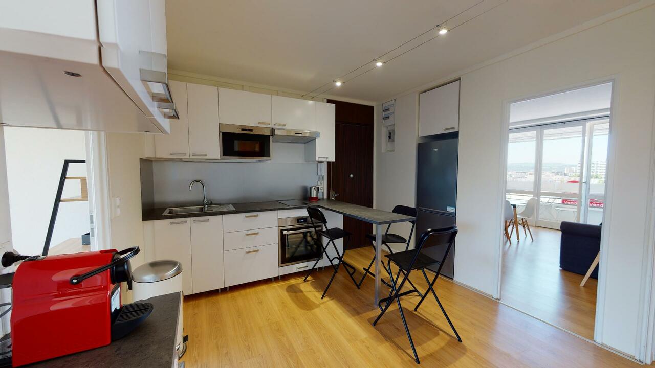 Ce T4 de 67 m² au 6e étage a été pensé et aménagé pour la vie en colocation à Bron : situé au 37 rue du parc, il est entièrement meublé et offre un bon compromis entre espace personnel et espace commun. Il possède aussi un balcon.
