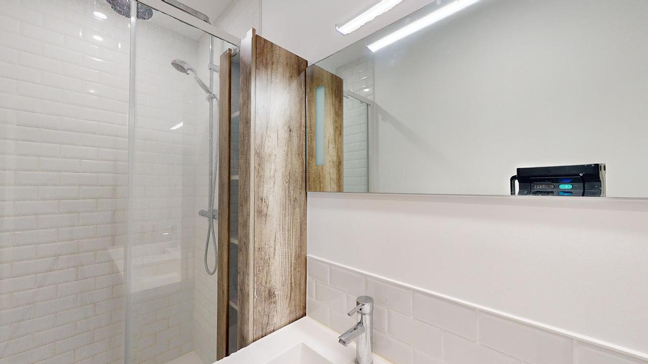 Une salle d'eau avec une douche, un meuble double vasque, un miroir ainsi qu'un porte-serviettes et des étagères.