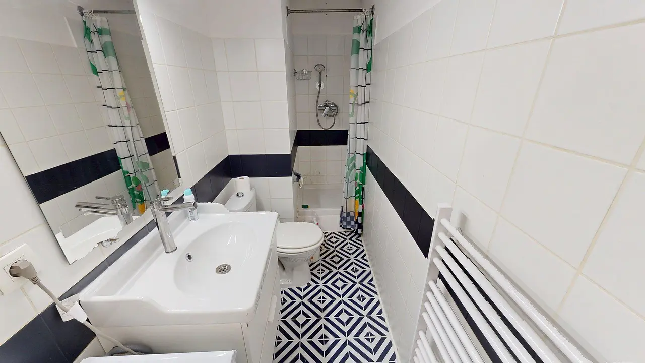 La salle d’eau comprend une douche, un meuble vasque avec miroir, un sèche-serviette, des toilettes, ainsi qu’une machine à laver.
