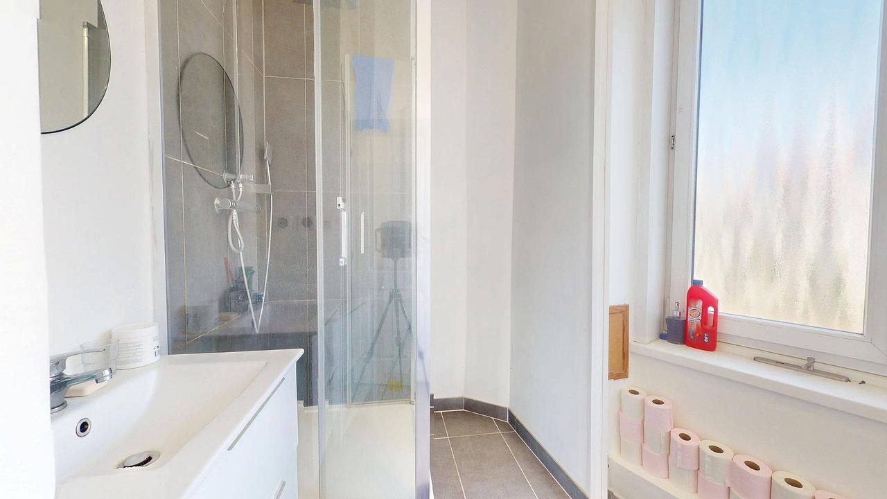 La salle d'eau comporte une douche, un meuble vasque avec miroir, ainsi que des toilettes.