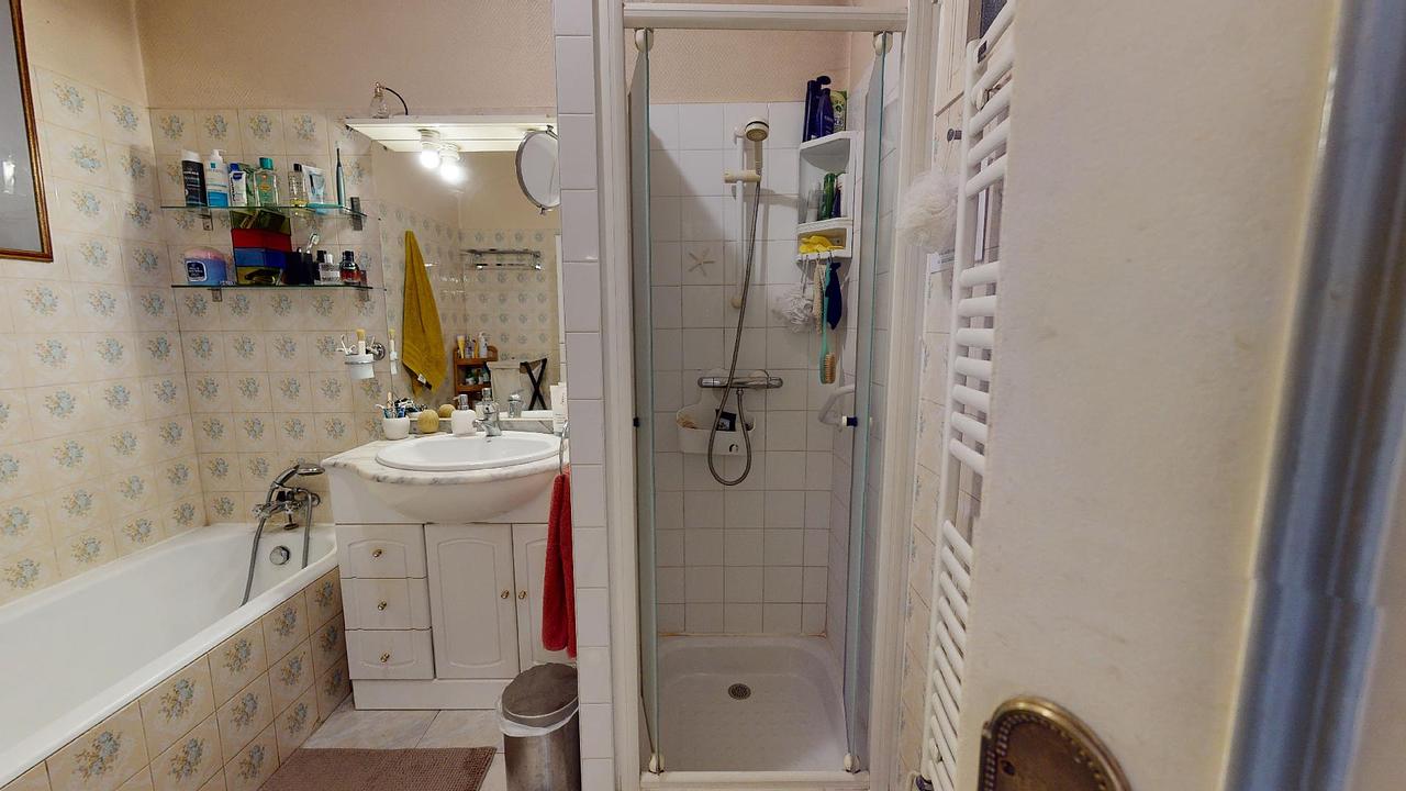 Une salle de bain avec baignoire, douche, meuble vasque ainsi que des WC séparés viennent compléter ce logement.