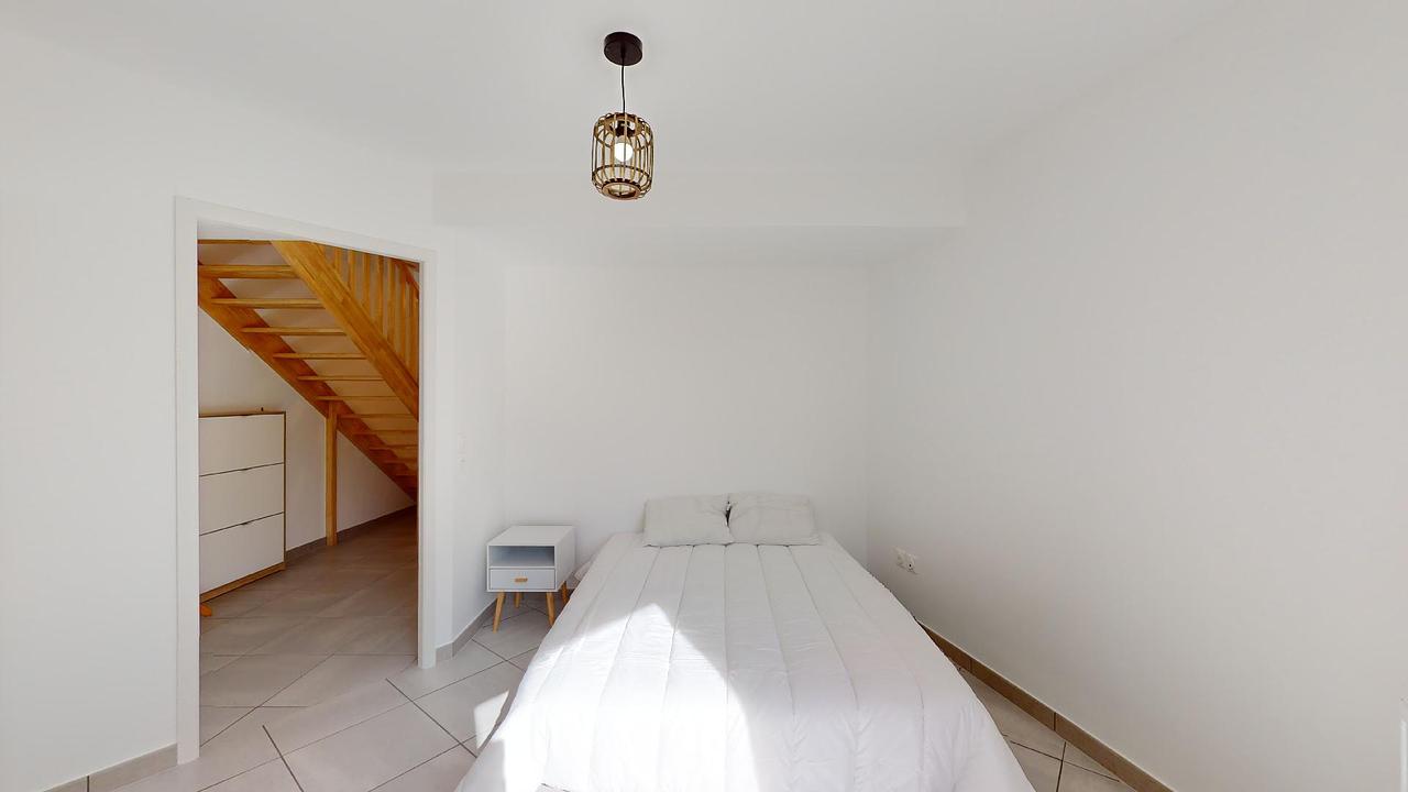 À l'étage, vous découvrirez les deux dernières chambres, une seconde salle de bain avec WC, baignoire et meuble vasque, ainsi qu'une pièce supplémentaire polyvalente équipée d'un canapé clic-clac, d'un fauteuil, de rangements et d'une seconde télévision.