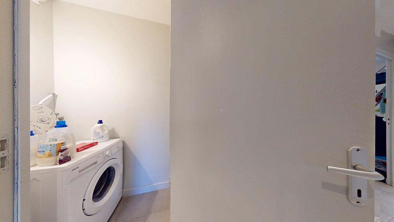 La pièce de vie principale, lumineuse et conviviale, se compose d’une cuisine ouverte sur un salon équipé d'un canapé. Cet espace de partage donne un accès direct à un premier balcon privatif, idéal pour profiter de l'extérieur. L'appartement dispose également d'un second balcon, partagé par trois des quatre chambres, offrant un espace extérieur supplémentaire. La cuisine a été spécialement conçue pour garantir une autonomie totale à chacun : en plus du four, du micro-ondes et des plaques de cuisson, chaque locataire dispose de son propre lave-vaisselle, de son propre réfrigérateur ainsi que de deux placards attribués. Cette organisation unique au sein d'une colocation facilite grandement le rangement et la gestion du quotidien pour les quatre occupants.