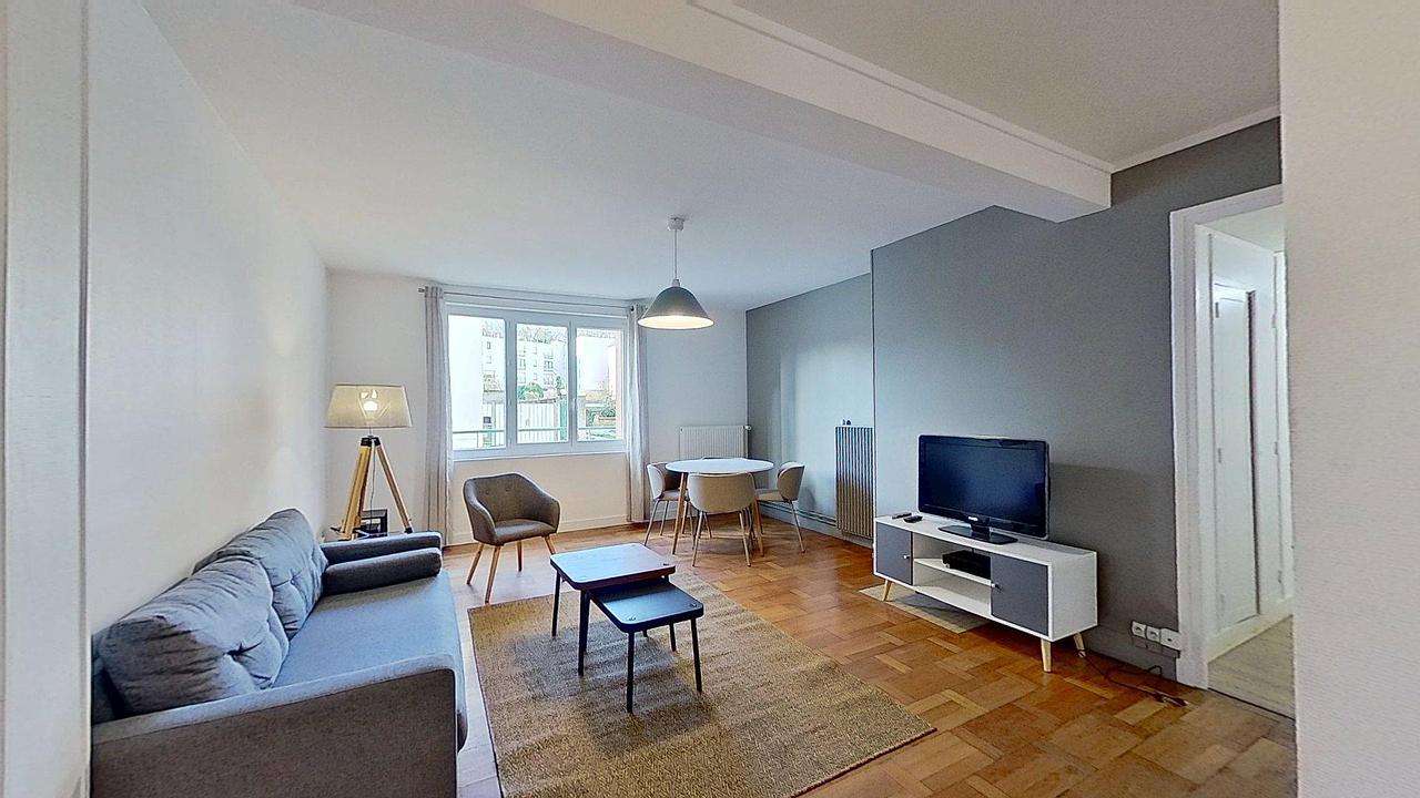 L’appartement s’organise autour d’une vaste pièce de vie lumineuse, aménagée avec un canapé confortable, deux fauteuils, une table basse et un espace repas convivial. Les grandes fenêtres et le parquet apportent une atmosphère chaleureuse, idéale pour des moments partagés entre colocataires.