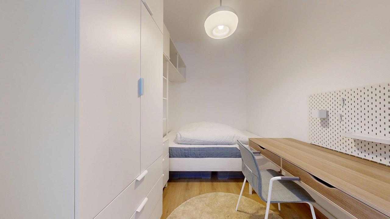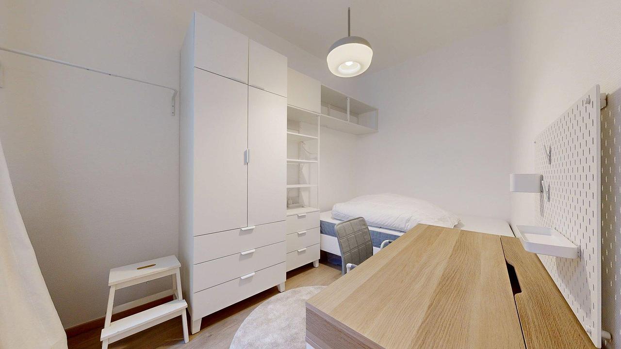 La chambre est meublée avec un lit double, un grand dressing (penderie et étagères), ainsi qu'un coin bureau.