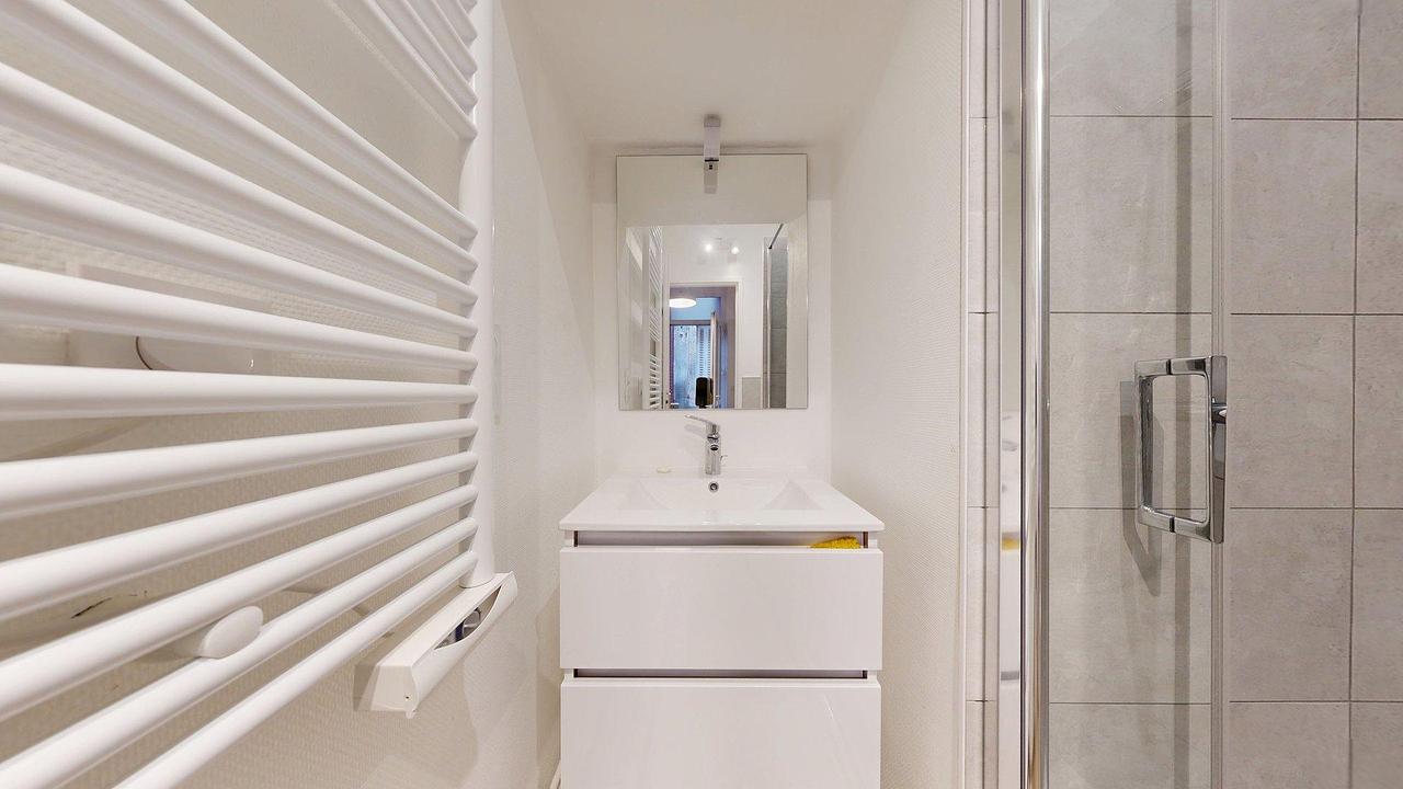 La salle d'eau comporte une douche moderne avec paroi vitrée, un meuble vasque avec de larges tiroirs de rangement, un miroir, un sèche-serviettes et des WC.