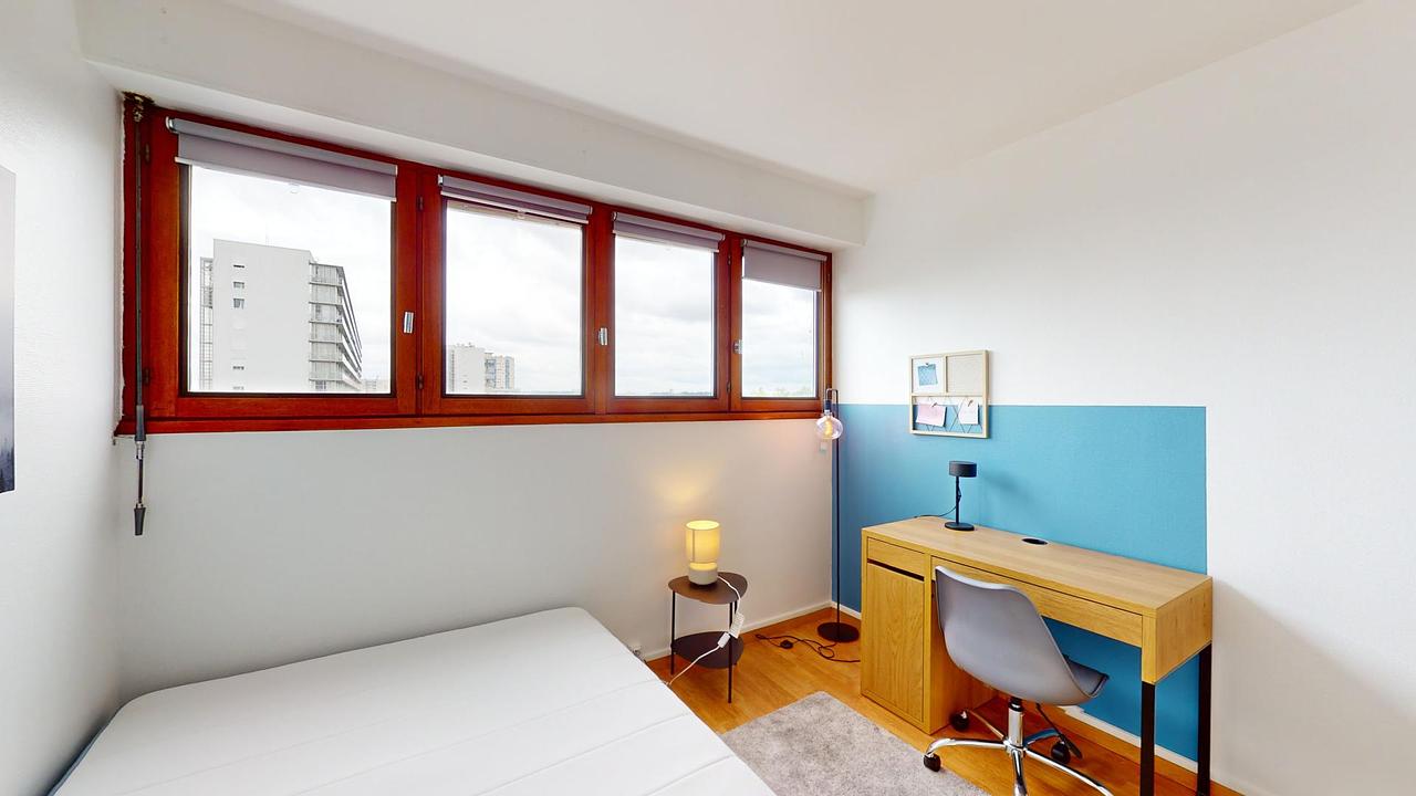 La chambre est louée avec un bureau, une penderie et un lit deux places. Cette pièce est particulièrement lumineuse grâce à trois fenêtres.