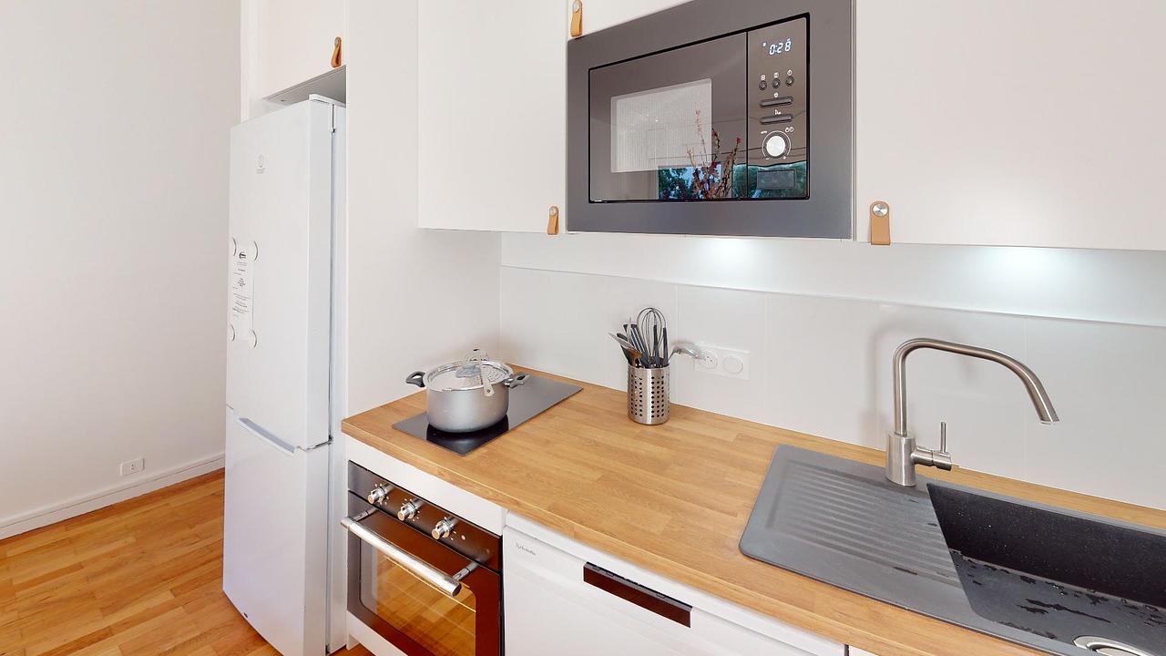 D’une cuisine équipée (frigo, plaque, four, lave vaisselle, lave linge)