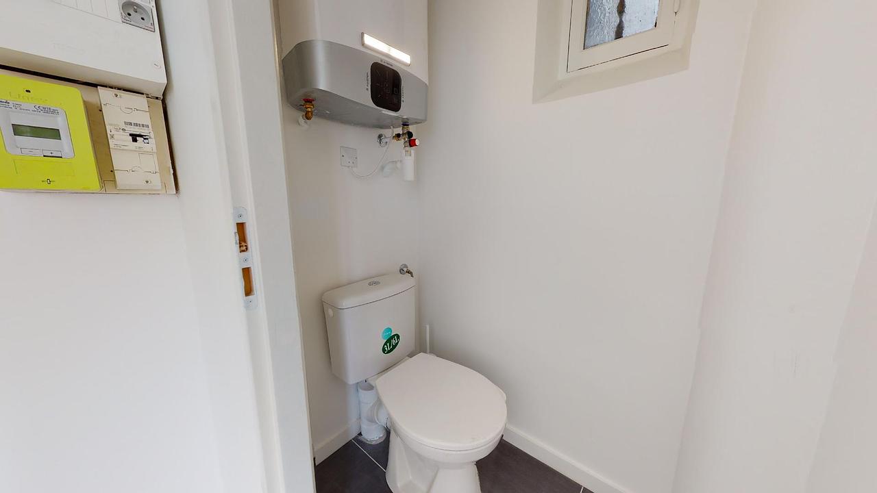 La salle de bain dispose d’une cabine de douche et d’une machine à laver. Les toilettes sont séparées.