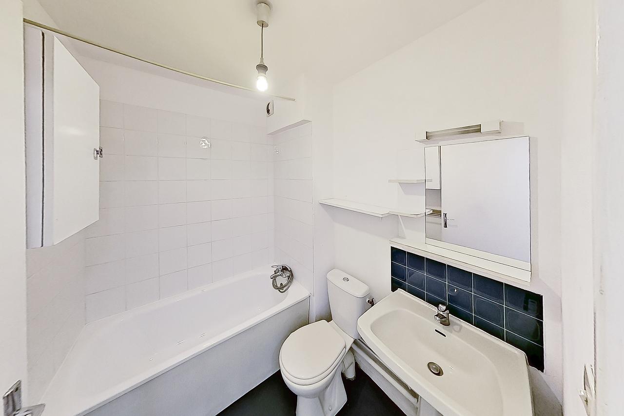 La salle de bain dispose d’une baignoire, d’un meuble vasque avec miroir, d’un WC et d’espaces de rangement.