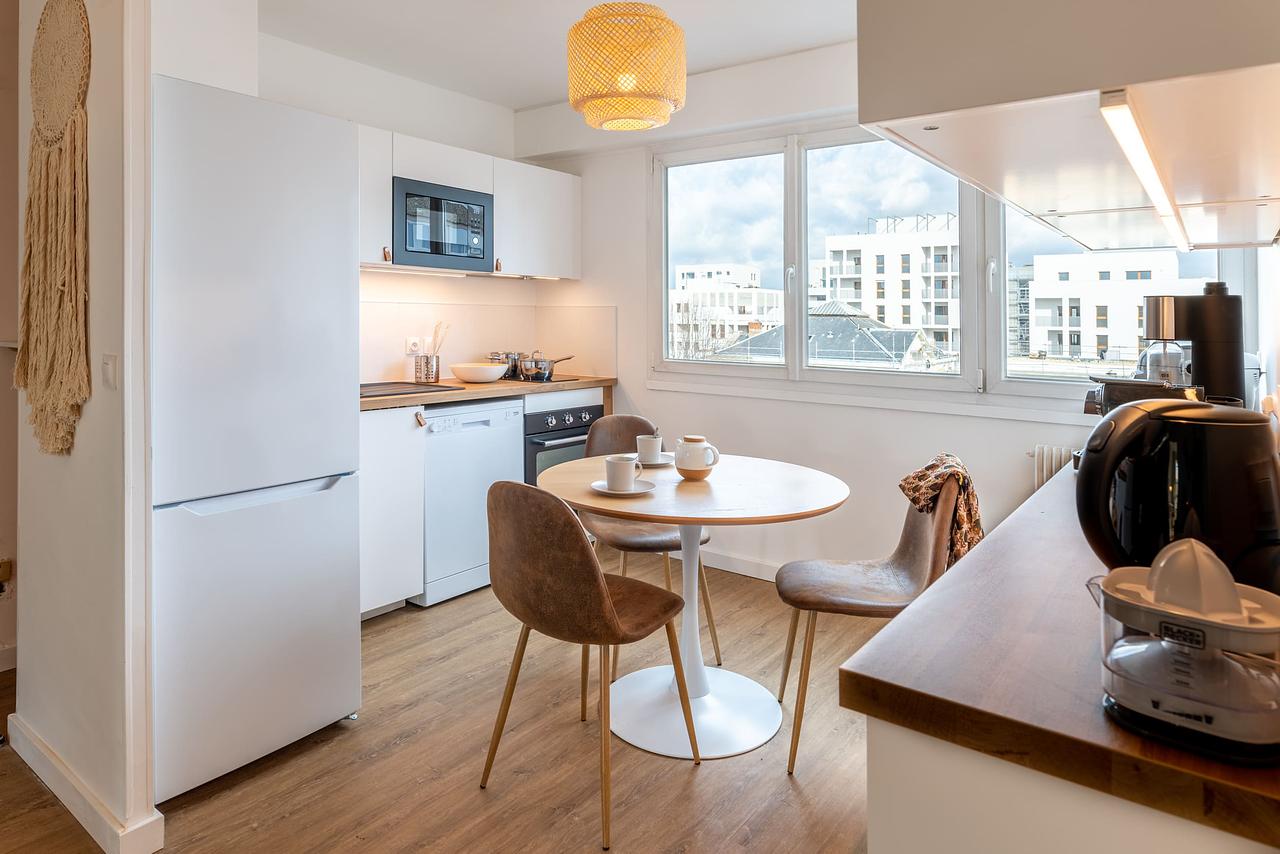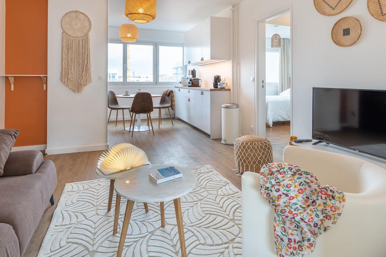 L’appartement se compose d’une agréable pièce de vie baignée de lumière, aménagée avec un salon confortable et un espace repas convivial. La cuisine, ouverte sur le séjour, est entièrement équipée et dispose de nombreux rangements ainsi que d’un large plan de travail. Elle comprend notamment un four, un micro-ondes et un lave-vaisselle, permettant un usage quotidien pratique et fonctionnel. La salle d’eau, moderne et bien entretenue, est équipée d’une douche, d’un meuble vasque avec rangements et d’un miroir éclairé.