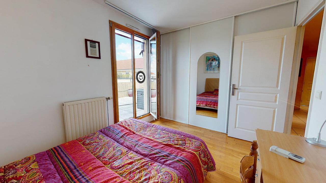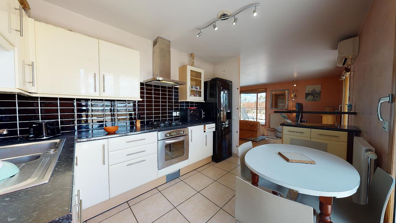 Ce T5 s'ouvre une très grande pièce de vie avec espace salle à manger, coin salon avec canapés et meuble TV, ainsi que de nombreux rangements. 3 grandes fenêtres donnent sur des terrasses aménagées, avec vue sur Villeurbanne et Lyon.