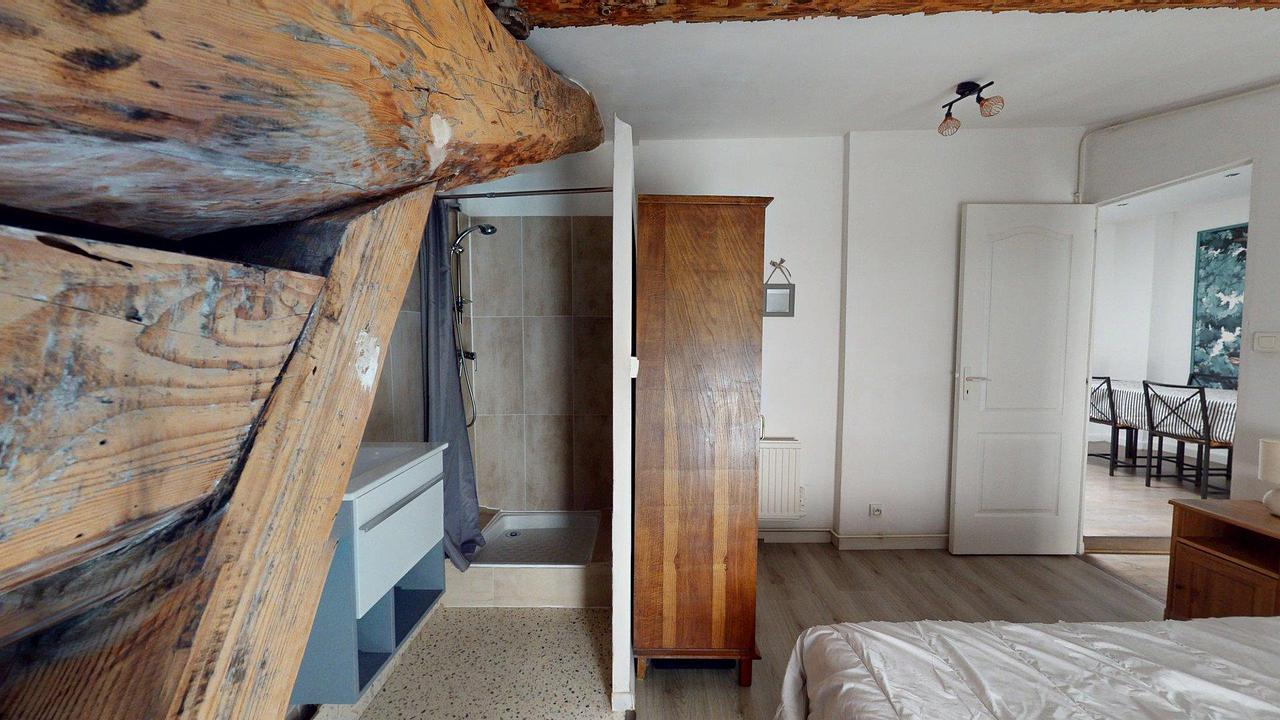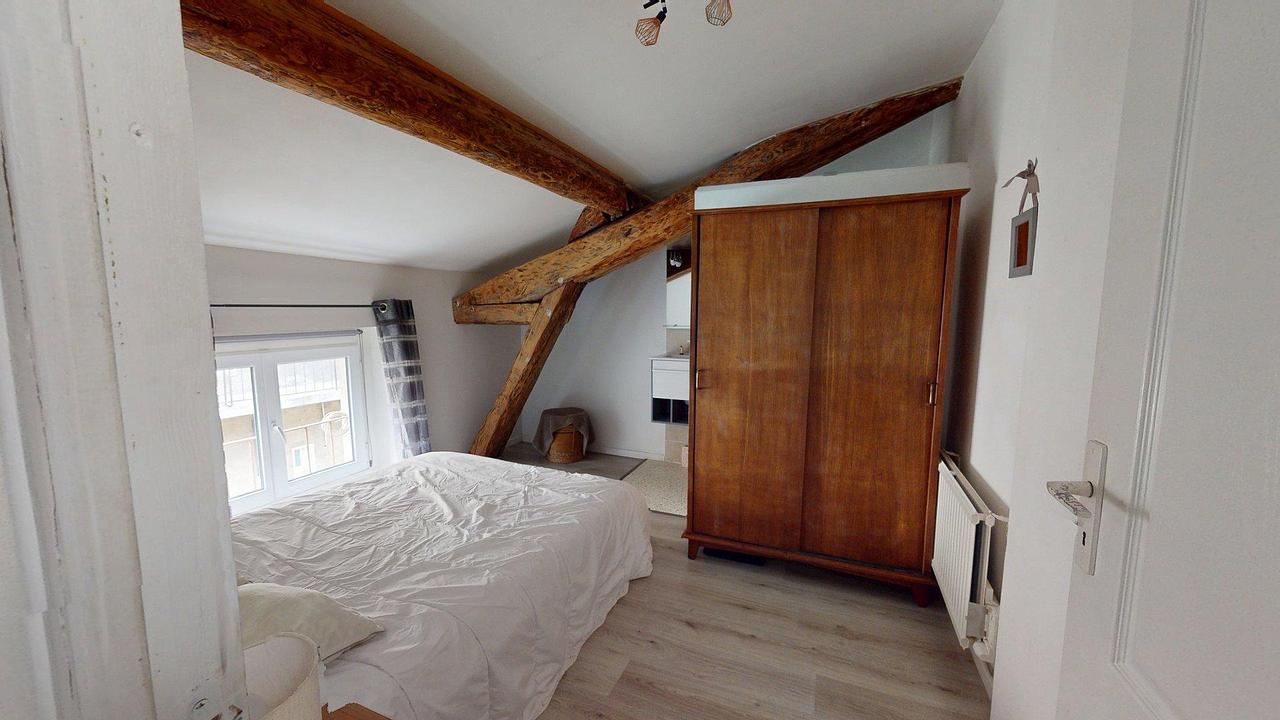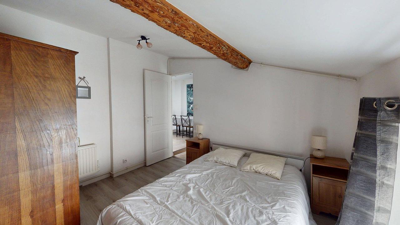 Accessible directement depuis le séjour, la chambre est meublée avec un lit double, deux tables de chevet, des lampes, un dressing et une fenêtre double vitrage avec rideaux. Le tout dans un esprit minimaliste et lumineux, avec parquet au sol et poutres apparentes.