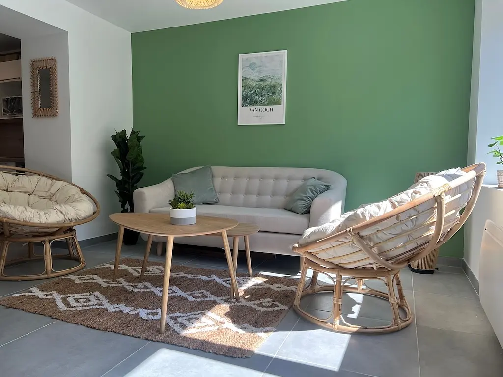 Cette colocation de cinq chambres s'ouvre sur une pièce de vie aménagée d'un canapé, de deux fauteuils, de tables basses gigognes ainsi que d'une table basse avec une télévision.