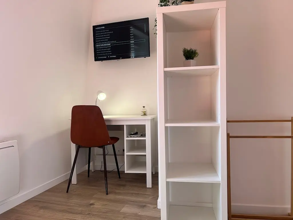 Cette chambre dispose d'un lit double, d'une bibliothèque, d'un bureau avec une chaise et une lampe ainsi que d'une armoire.