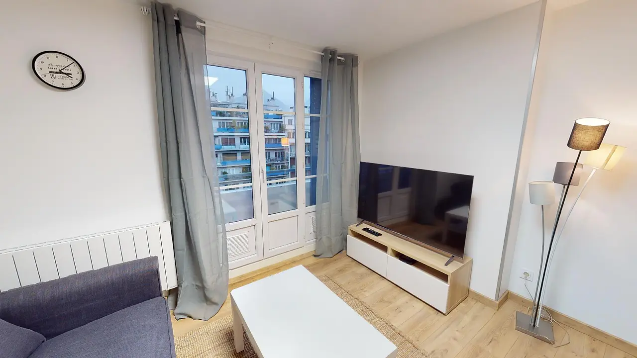 L'appartement comporte une belle pièce de vie avec canapé, table basse, TV et meuble TV et une cuisine ouverte.