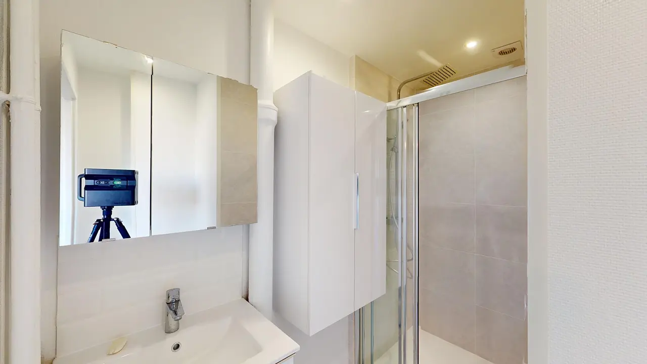 La chambre, très lumineuse, est attenante à la salle d'eau. Cette dernière dispose d'une cabine de douche, d'un meuble vasque, d'un miroir et de deux meubles de rangements. Les toilettes sont séparées.