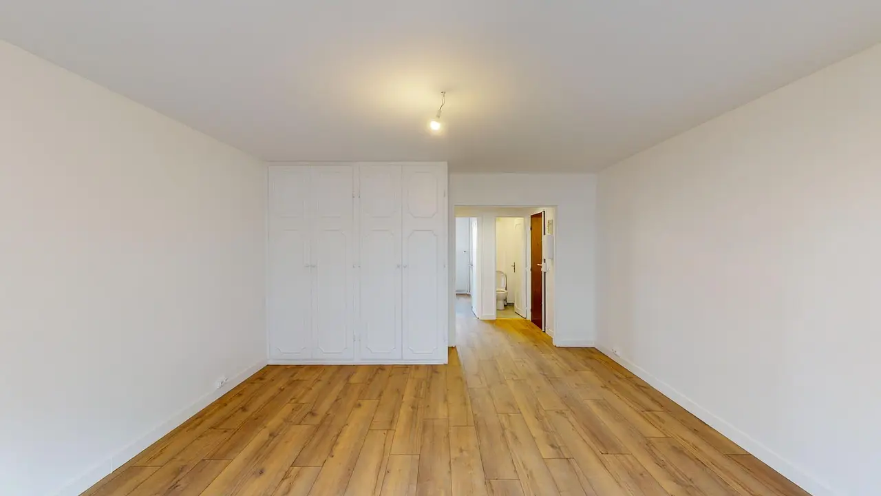 Cet appartement s'ouvre sur un grand salon spacieux et lumineux, facilement aménageable. La pièce dispose de deux grands placards muraux et dispose d'un accès direct sur le balcon.
