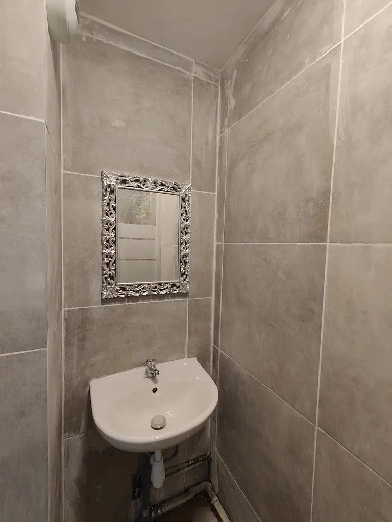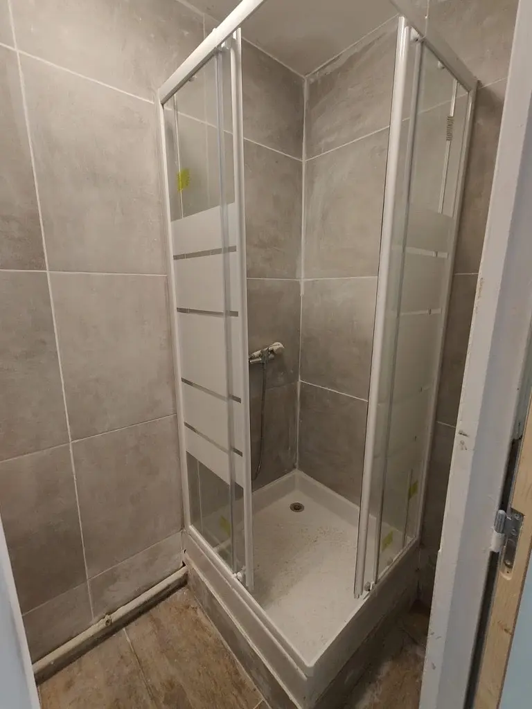 La salle d'eau comprend une douche et un meuble vasque avec miroir.