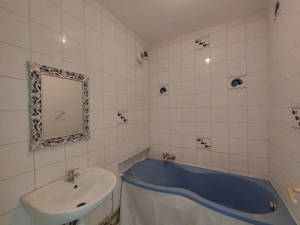 La salle de bain comporte une baignoire, ainsi qu'un meuble vasque avec miroir.