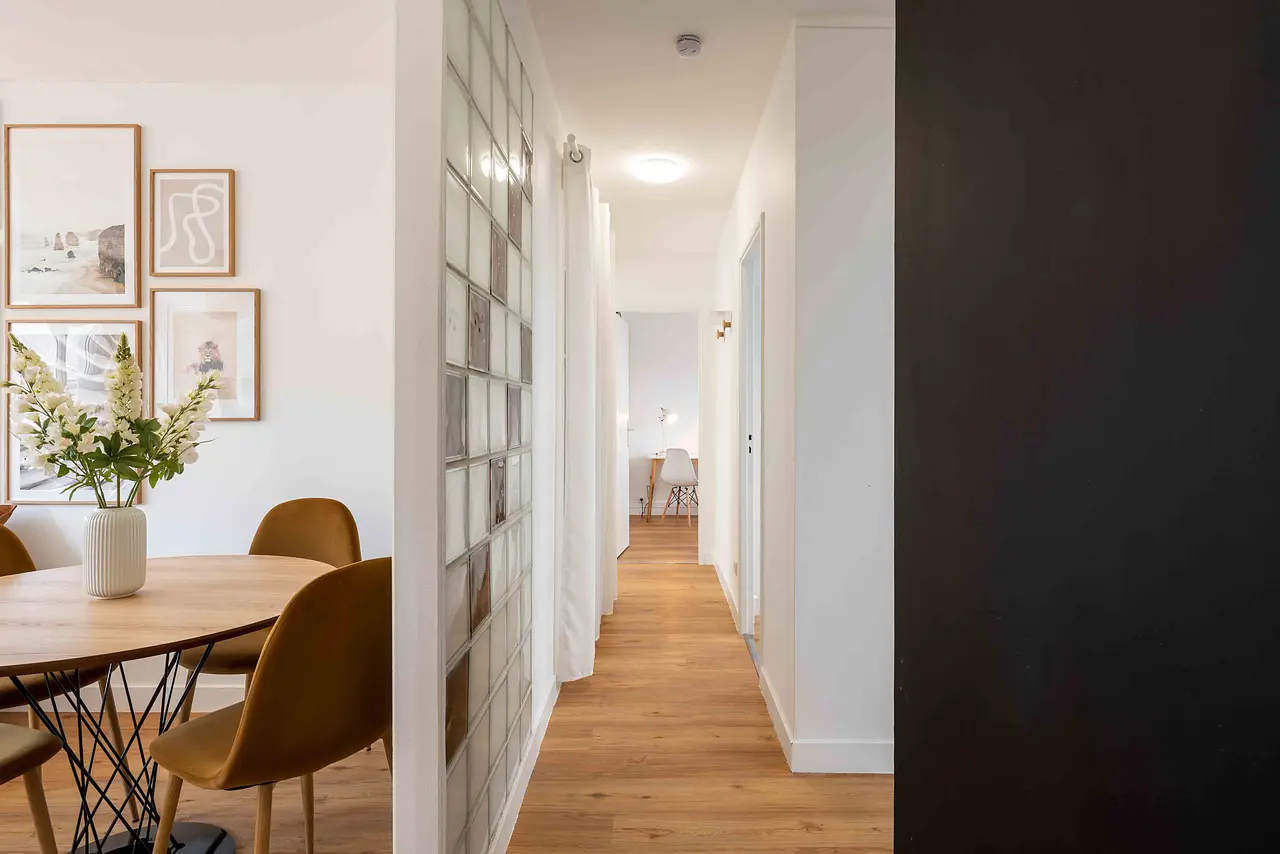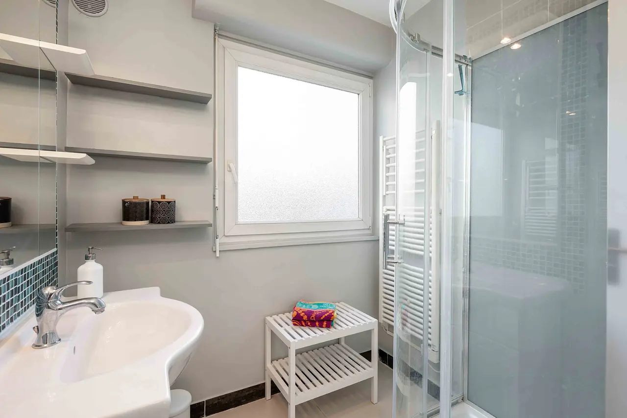Un couloir dessert les 4 chambres de l’appartement, ainsi que la salle de bains agrémentée d’une fenêtre. Elle est aménagée avec un meuble lavabo, une grande cabine de douche et des WC séparés. De grands placards sont disponibles dans le couloir pour tous les colocataires.