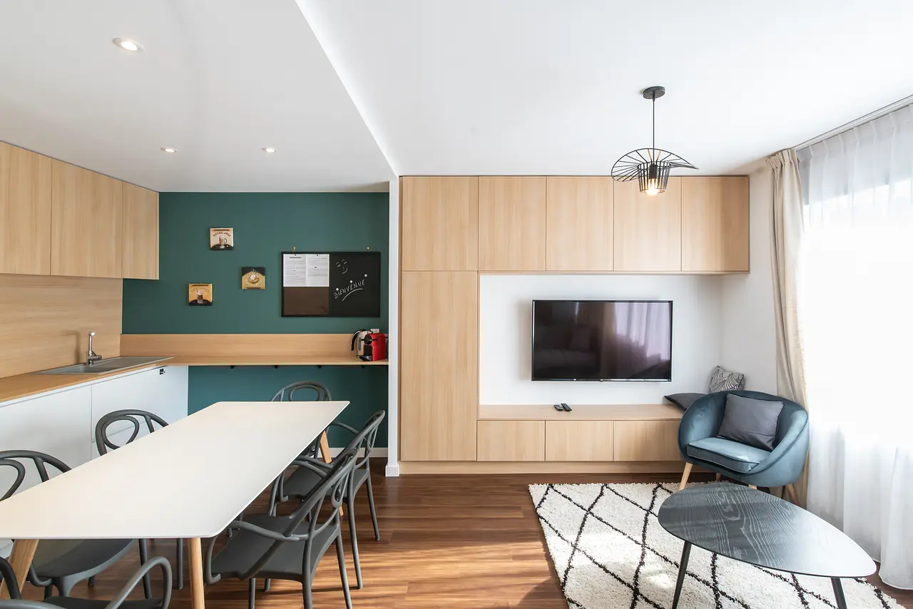 🛋️ ESPACES COMMUNS PREMIUMLa pièce de vie spacieuse et lumineuse offre un beau volume de 26 m² et est entièrement meublée avec un canapé confortable, une table basse, un fauteuil, une télévision et de nombreux rangements. Un espace parfait pour se détendre, partager des moments conviviaux ou travailler.