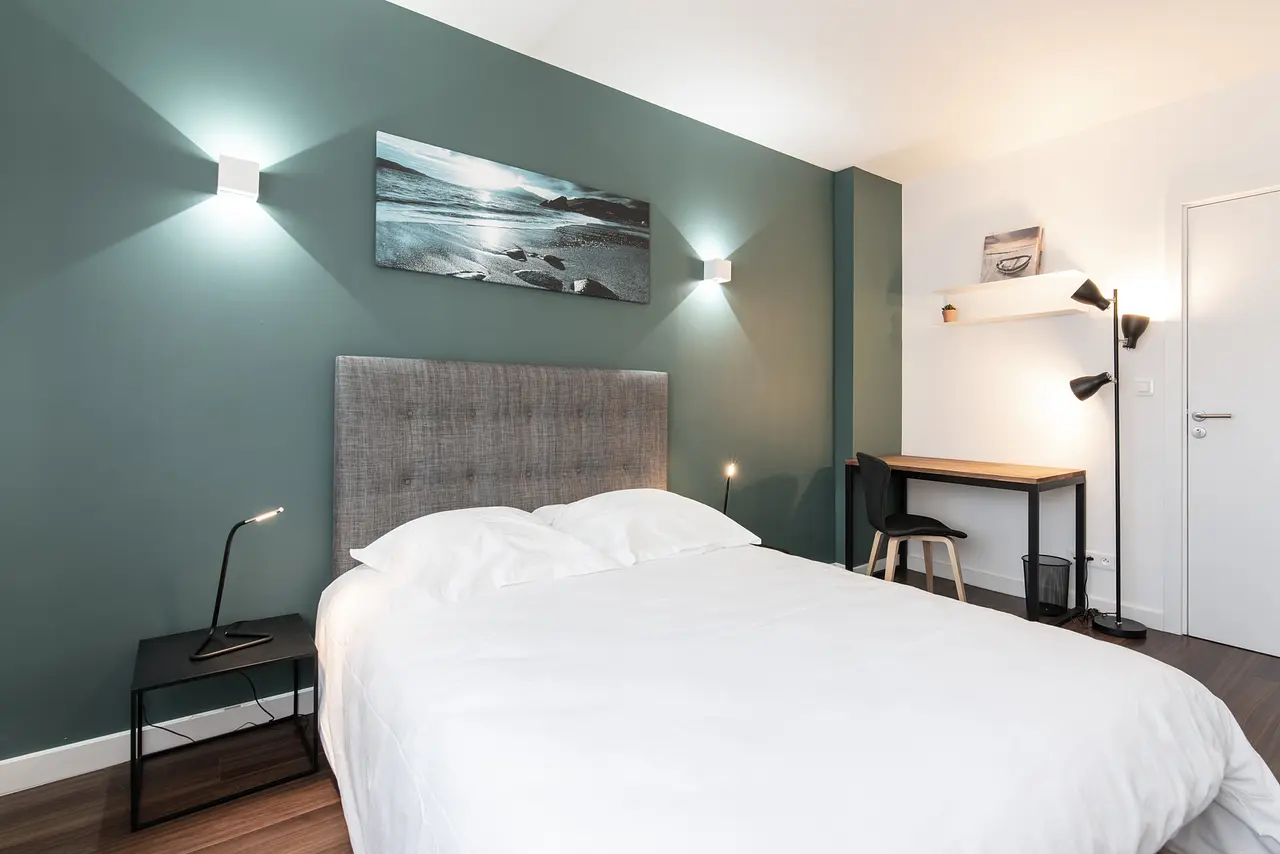 Chaque chambre dispose d’une salle d’eau privative, avec douche, sèche-serviette, lavabo et miroir. Elles sont toutes équipées d’un lit double, d’un bureau et d’un placard de rangement, offrant intimité et confort optimal.