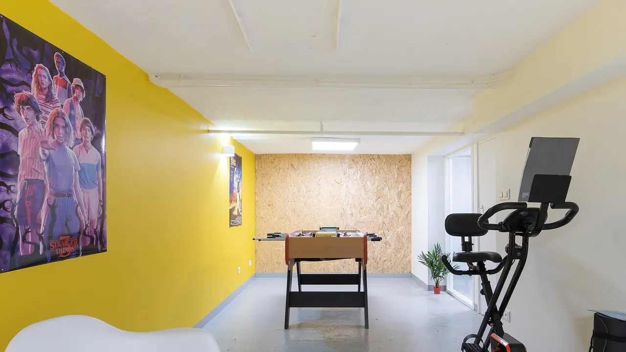 Une salle conviviale avec fauteuils, baby-foot, vélo d’entraînement et jeux de fléchettes