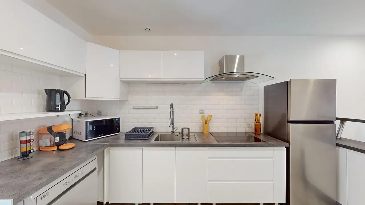 Une cuisine équipée d'un micro-ondes, un réfrigérateur, une machine à café, une hotte, une plaque de cuisson à induction, un lave-vaisselle et des ustensiles de cuisine.