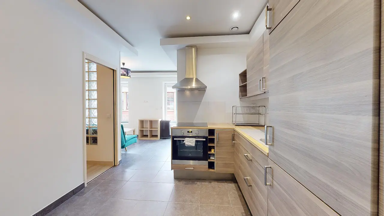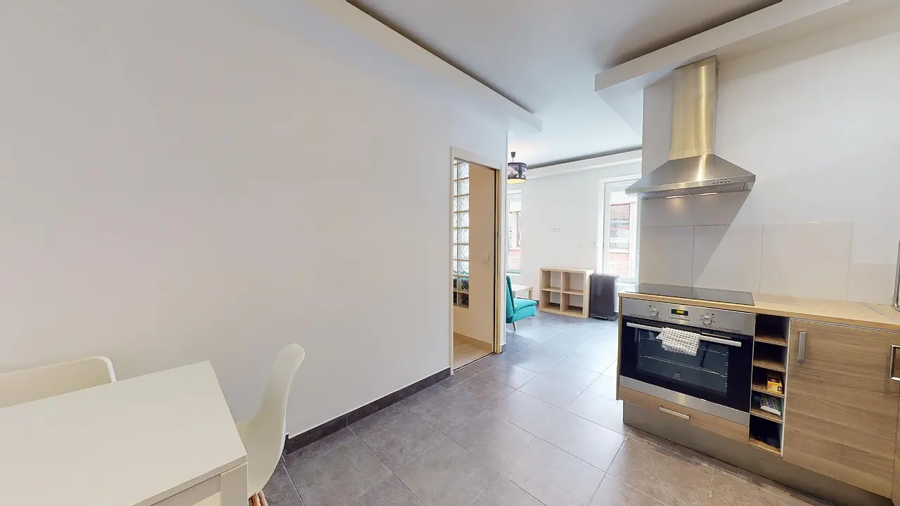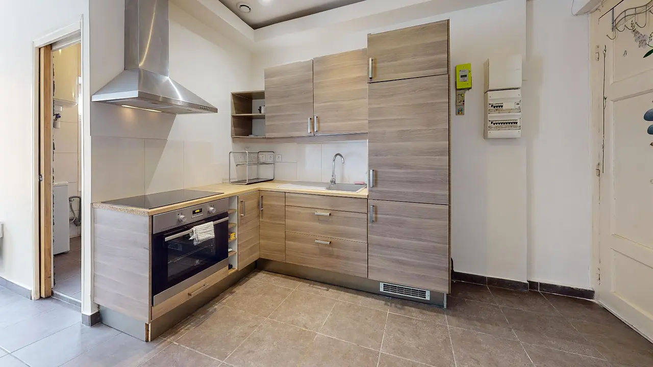 L'appartement est composé d'une grande pièce de vie carrelée avec toutefois deux espaces distincts : la cuisine intégrée d’un côté (four, plaques de cuisson, hotte, réfrigérateur avec partie congélateur, table à manger), le salon de l’autre.