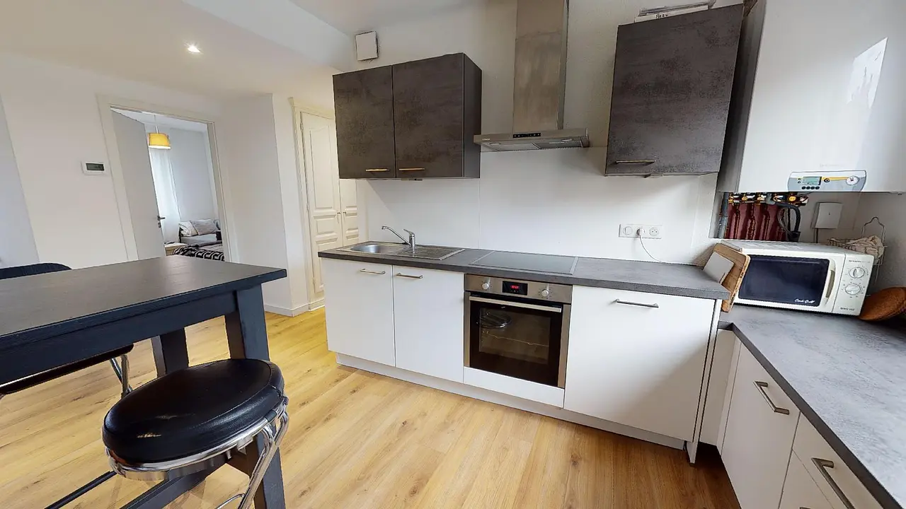 La cuisine est entièrement équipée et fonctionnelle : four, plaques de cuisson, hotte, table haute et de nombreux rangements.