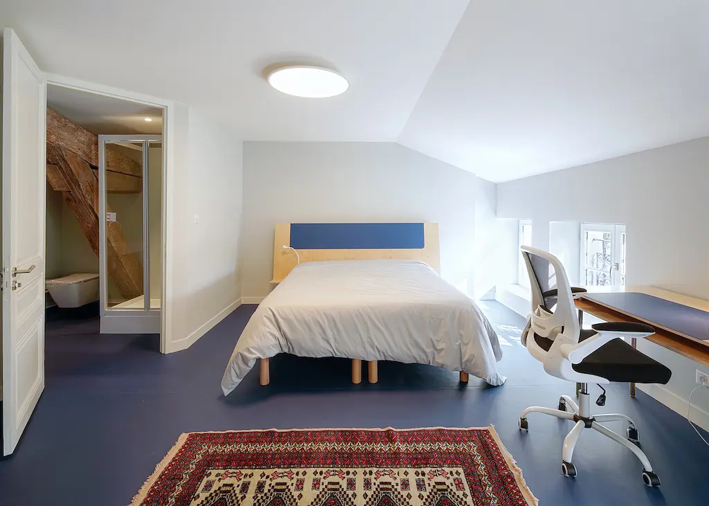 Cette chambre offre un niveau de confort de type hôtelier, salle d’eau et un WC privatif, literie 160x200, bureau, rangements, miroirs.