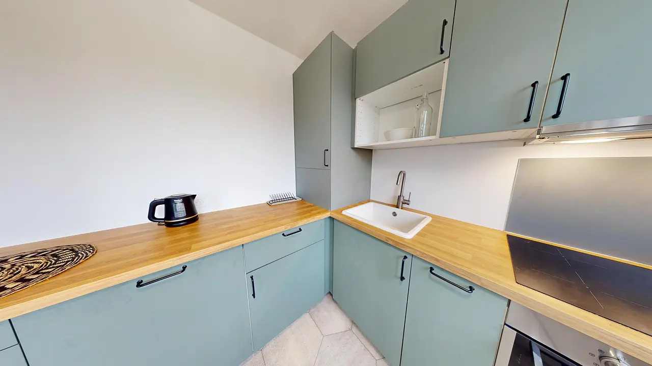 La cuisine est meublée d'un meuble de rangement. Elle comporte également un four, un lave-vaisselle, une machine à café, un micro-ondes et une plaque de cuisson.