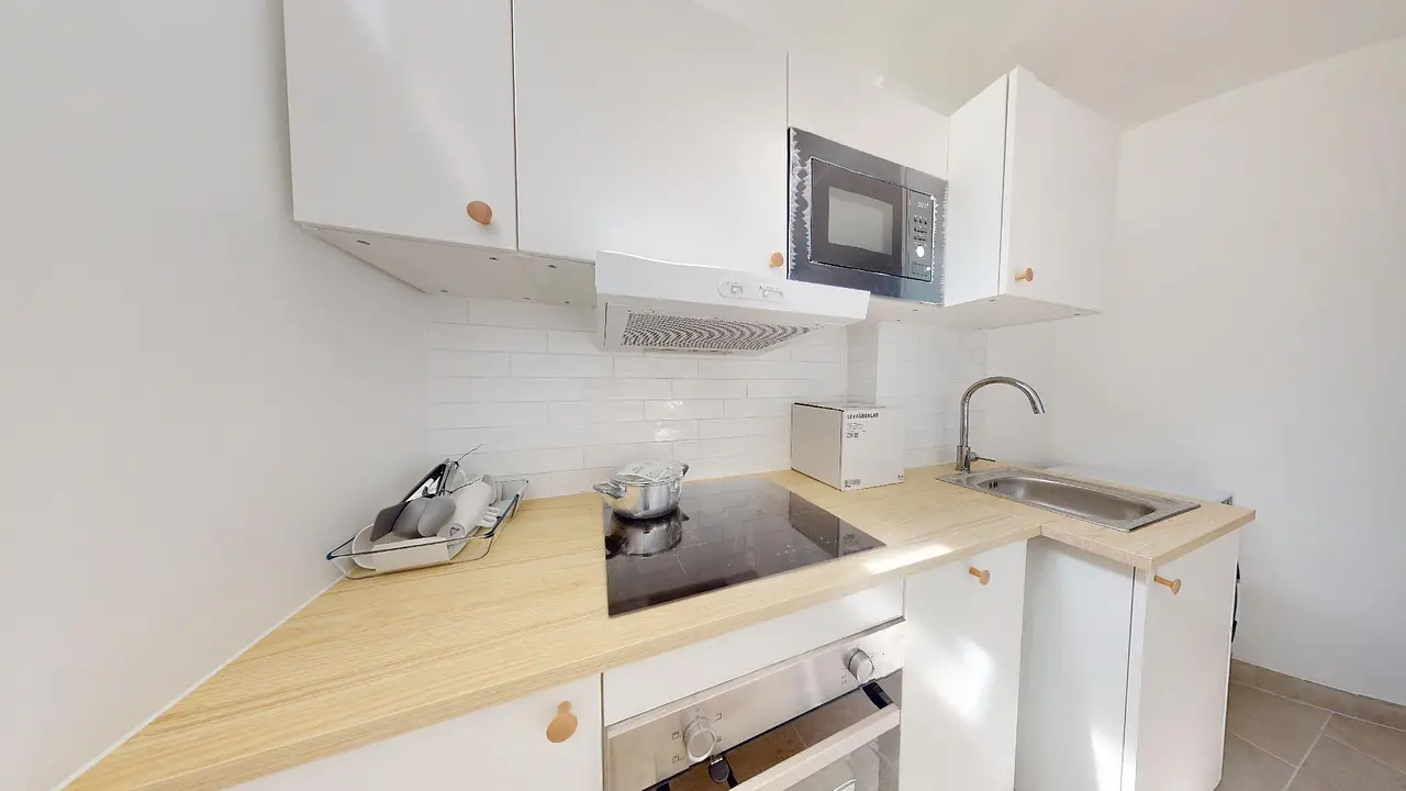 La cuisine est louée avec un four, un lave-vaisselle, un meuble de rangement, un micro-ondes et une plaque de cuisson.