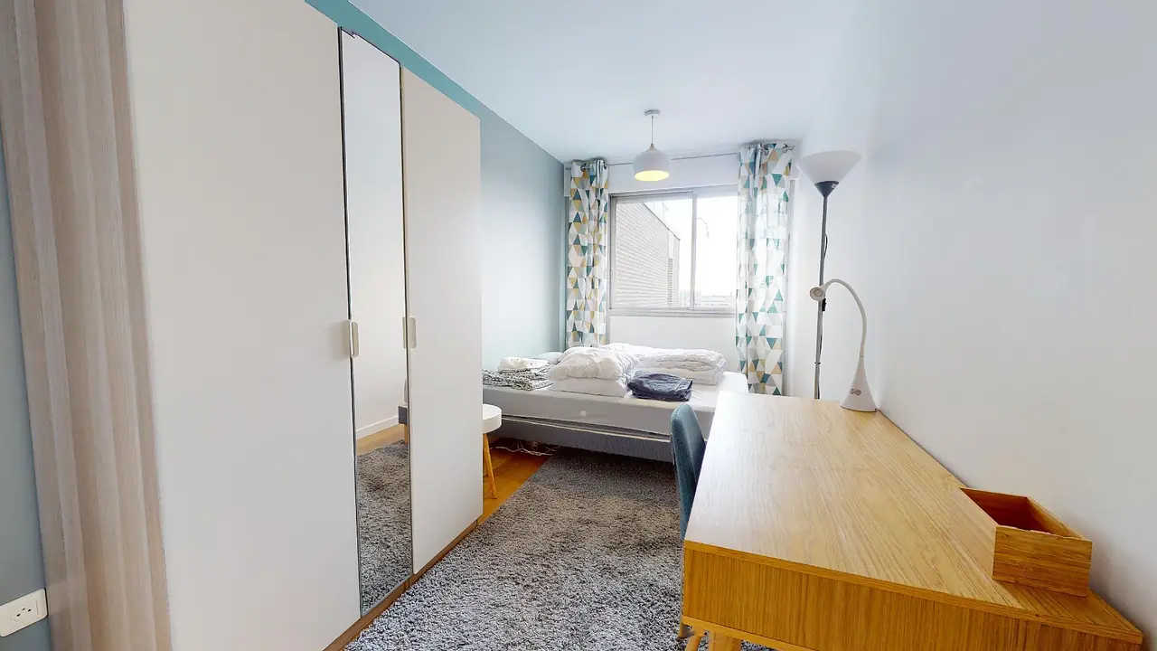 La chambre est composé d’un grand lit double, d’un bureau, d’une table de chevet, d’une lampe, d’un tapis et d’un placard de rangement/dressing