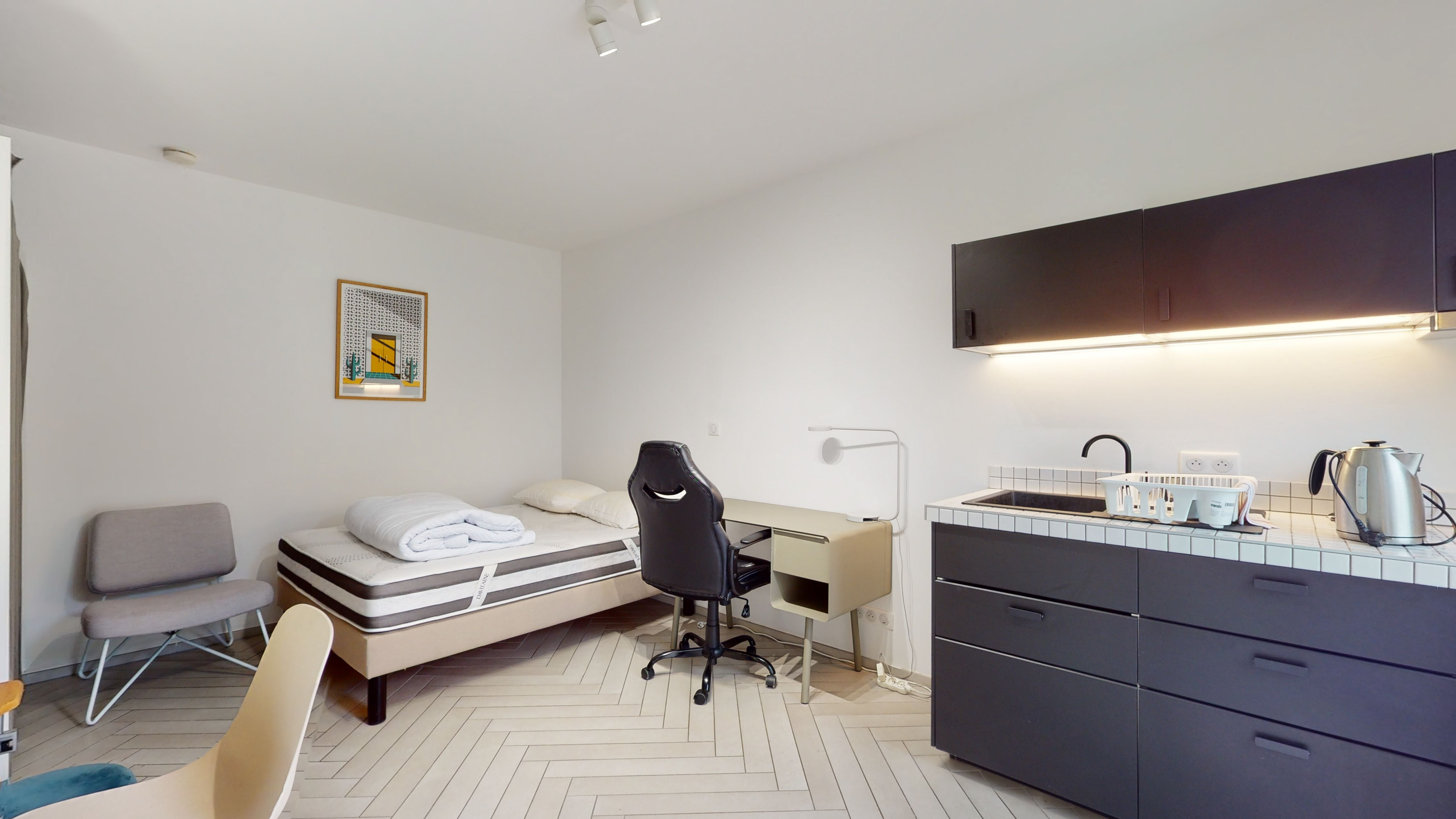 Le Studio 3, situé au rez-de-chaussée et donnant sur le jardin, est parfait pour une personne. Il dispose de sa propre cuisine et salle de bain pour votre intimité et confort. Le studio est meublé avec un lit confortable, une penderie pour vos vêtements, un fauteuil pour vous détendre et un bureau pour travailler ou étudier. Vous trouverez également tout ce dont vous avez besoin pour la vie quotidienne : des plaques de cuisson, une machine à café, un micro-ondes et un réfrigérateur.